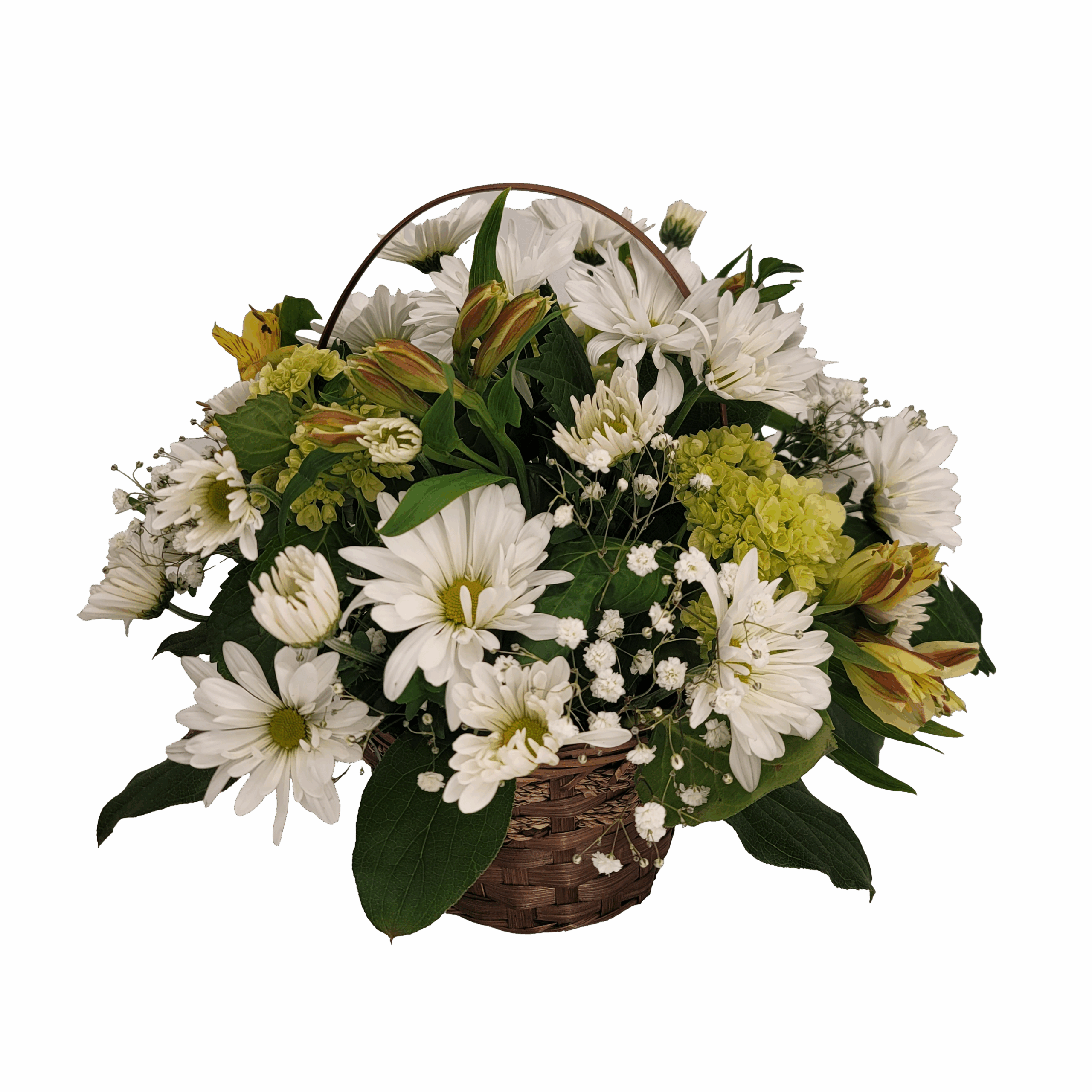 A charming flower arrangement with white daisy mums, lush hydrangeas, and delicate alstroemeria, elegantly presented in a wicker basket. This delightful ensemble blends classic and contemporary elements, offering a fresh, uplifting ambiance perfect for any occasion.